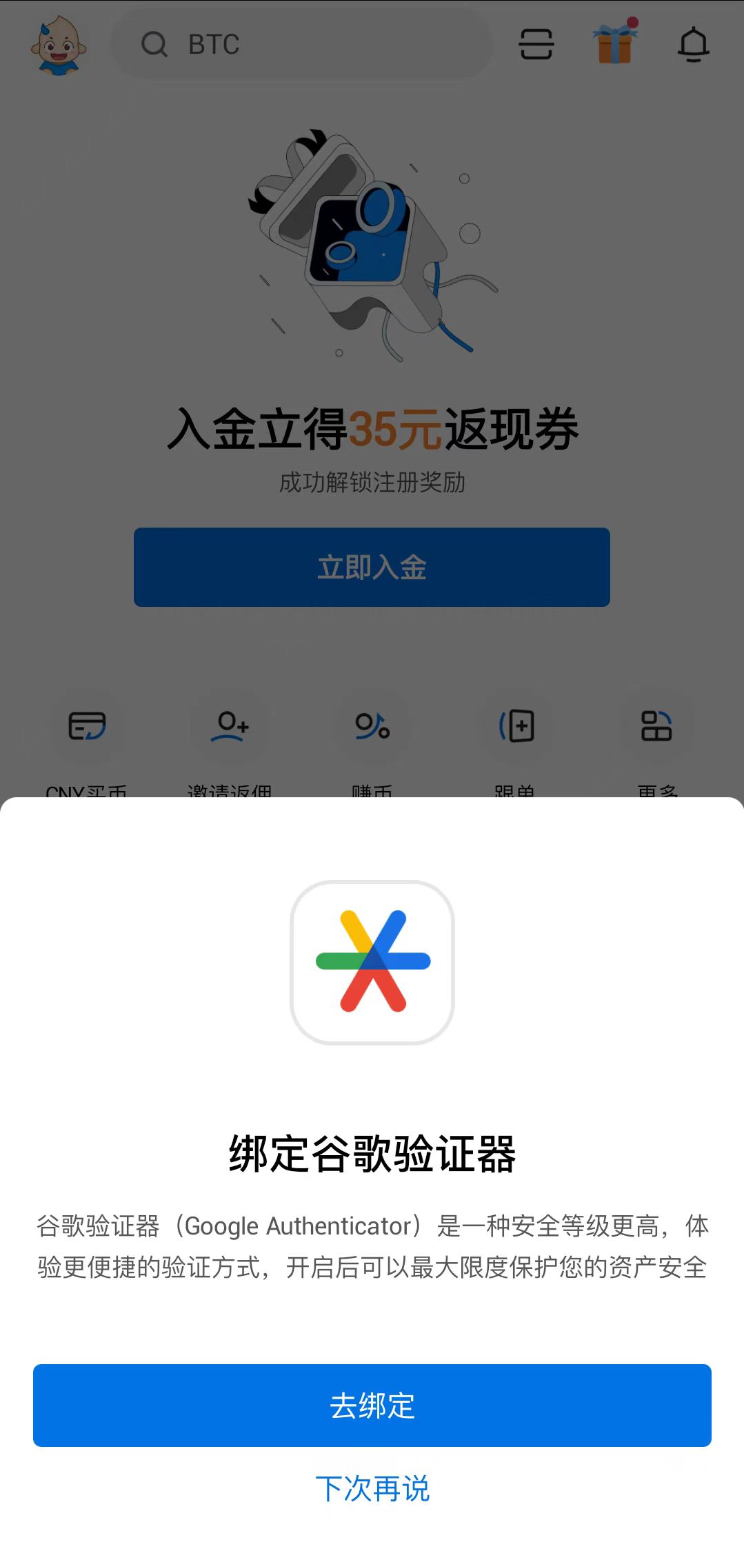 (7)绑定谷歌验证器(Google Authenticator)。通过使用谷歌验证器进行安全验证,可以解锁更多的交易功能,还可以提高账户的安全性。建议用户在注册账户时就进行绑定。